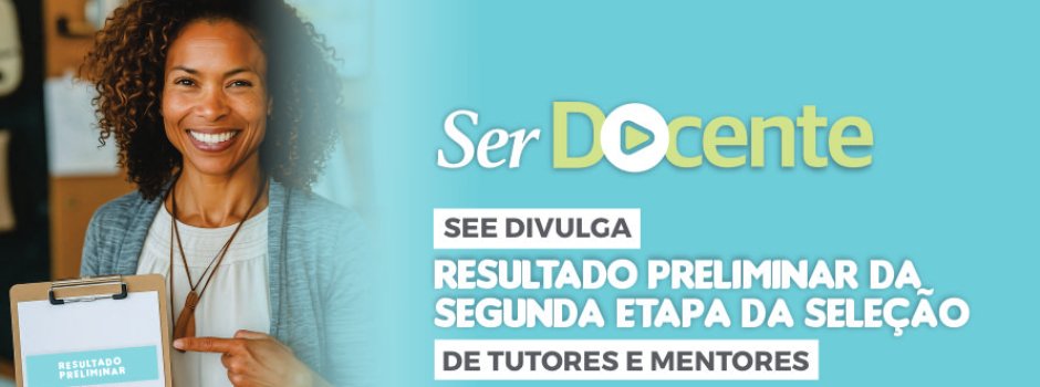 A Secretaria de Estado de Educação de Minas Gerais (SEE/MG) divulgou, nesta quarta-feira (16/7), o resultado preliminar da Avaliação Digital do processo seletivo para tutores e mentores do Programa Ser Docente. Os candidatos que participaram da prova realizada no último domingo (13/7), podem consultar o resultado neste link.