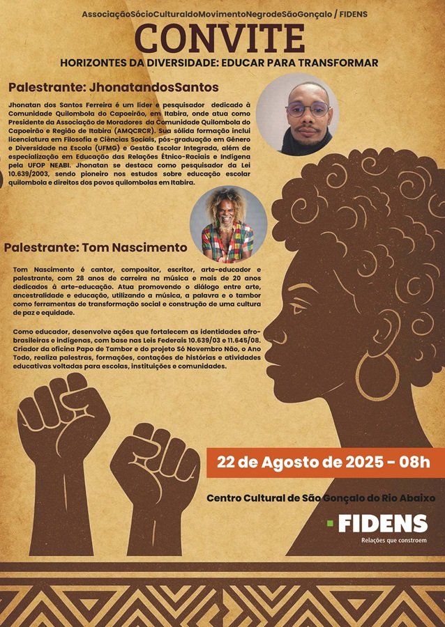 No dia 22 de agosto de 2025, às 08h, o Centro Cultural de São Gonçalo do Rio Abaixo será palco do evento Horizontes da Diversidade: Educar para Transformar, uma iniciativa da Associação Sócio Cultural do Movimento Negro de São Gonçalo, em parceria com a empresa FIDENS e a Secretaria Municipal de Cultura e Turismo.